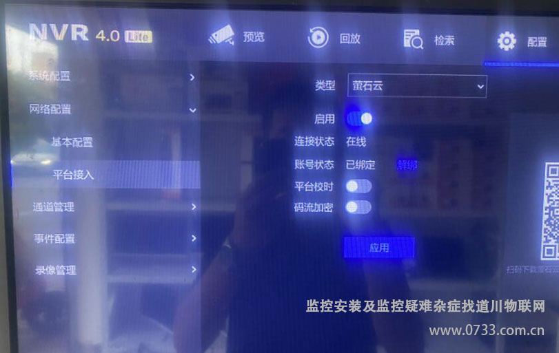 新版本的固件升級成功后,把錄像機與顯示器連接,會顯示新版的登陸頁面和界面風格,然后點擊配置-網絡配置-平臺接入,會發現螢石云的賬號狀態出現了解綁按鈕,解綁后,點擊應用。然后修改右邊二維碼上面的驗證碼。使用手機螢石云APP重新掃描即可綁定成功。